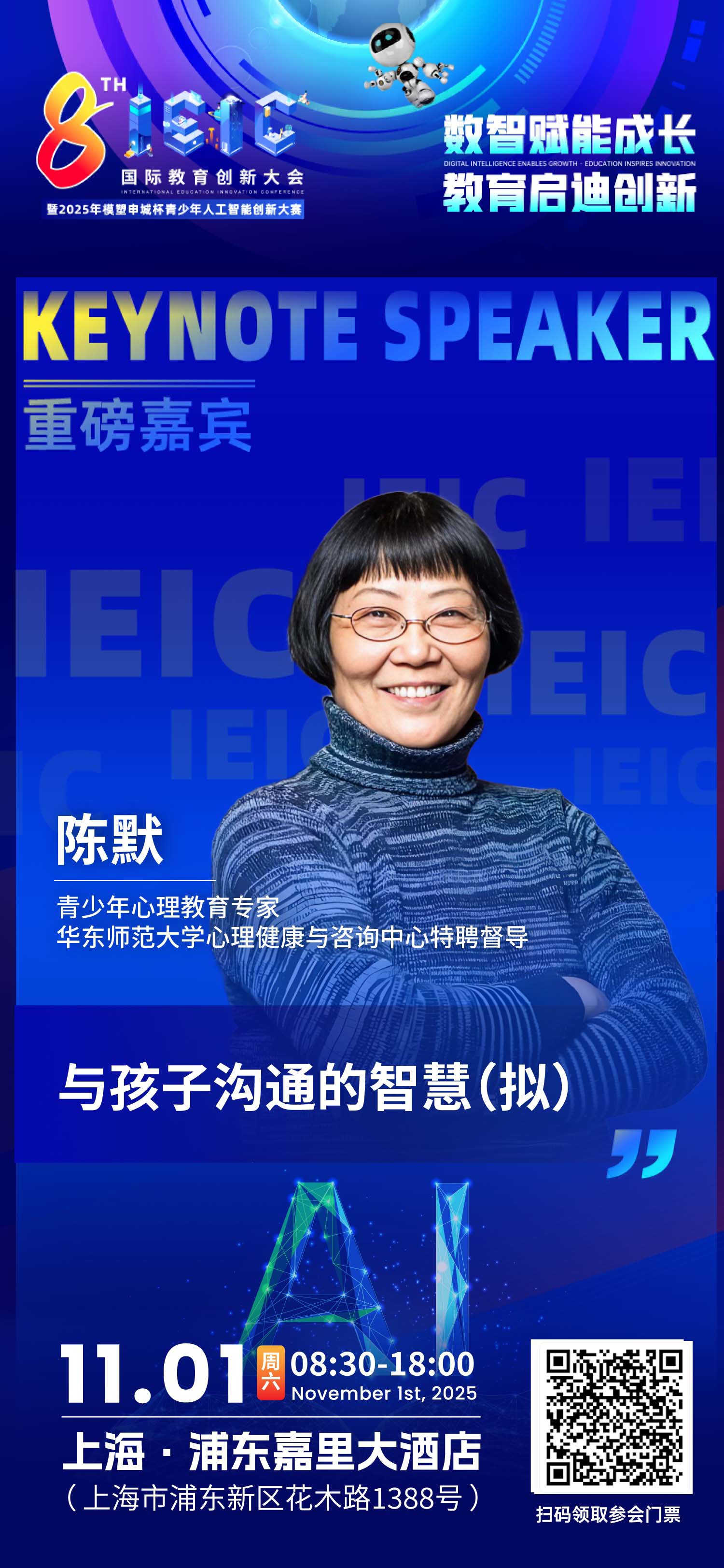 我們榮幸宣布,青少年心理教育專家、華東師范大學心理健康與咨詢中心特聘督導陳默女士將作為重磅嘉賓出席IEIC大會并發表演講。