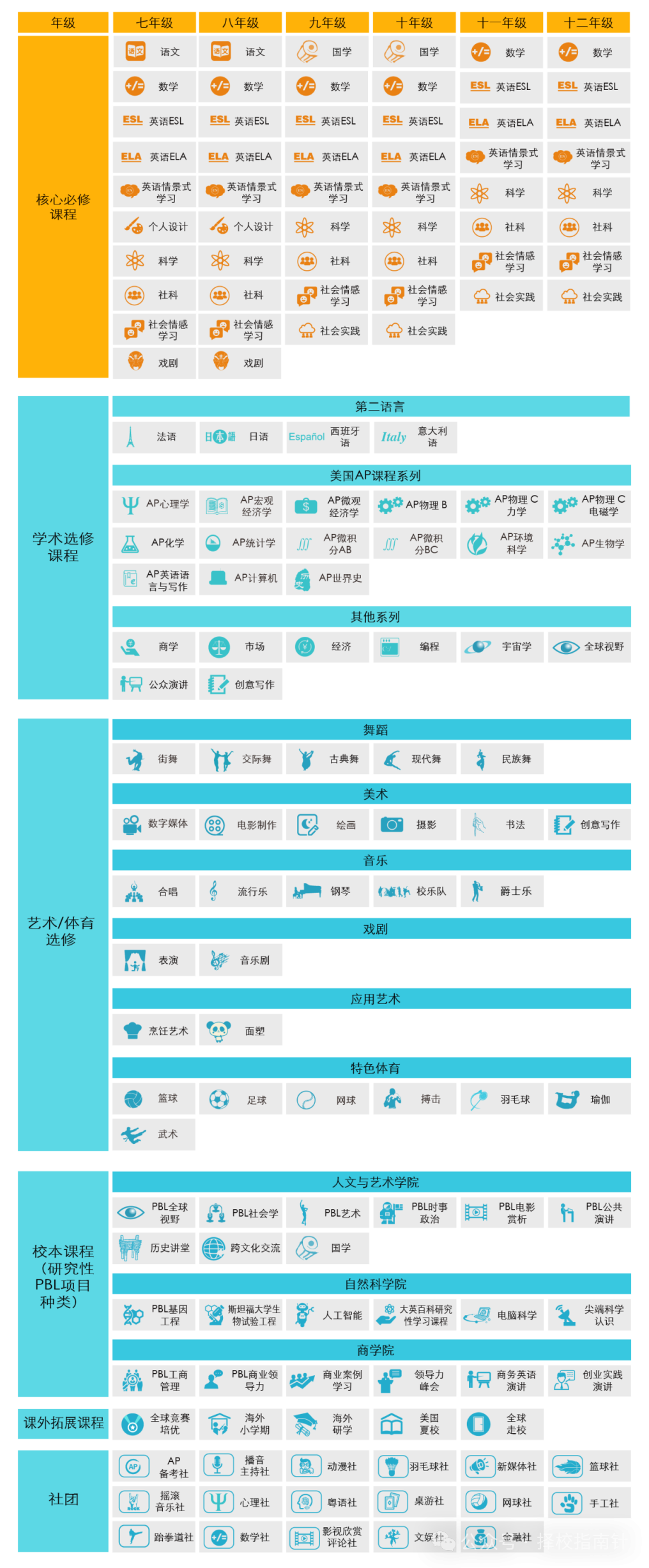 橘郡的美高國際課程體系是采用美國加州橘郡安納海姆聯(lián)合高中學(xué)區(qū)教育局的核心課程體系——美國加州牛津中學(xué)的Gateway、Pathway課程,符合美國加州大學(xué)A-G的課程標(biāo)準(zhǔn)。課程設(shè)置包括核心必修課程、學(xué)術(shù)選修課、AP課程、藝術(shù)/體育選修課、研究型PBL項(xiàng)目課程、課外拓展課程以及學(xué)生社團(tuán)課,并且采用分層教學(xué)、分級(jí)授課的模式,確保每一個(gè)學(xué)生都有一份專屬于自己的課表。