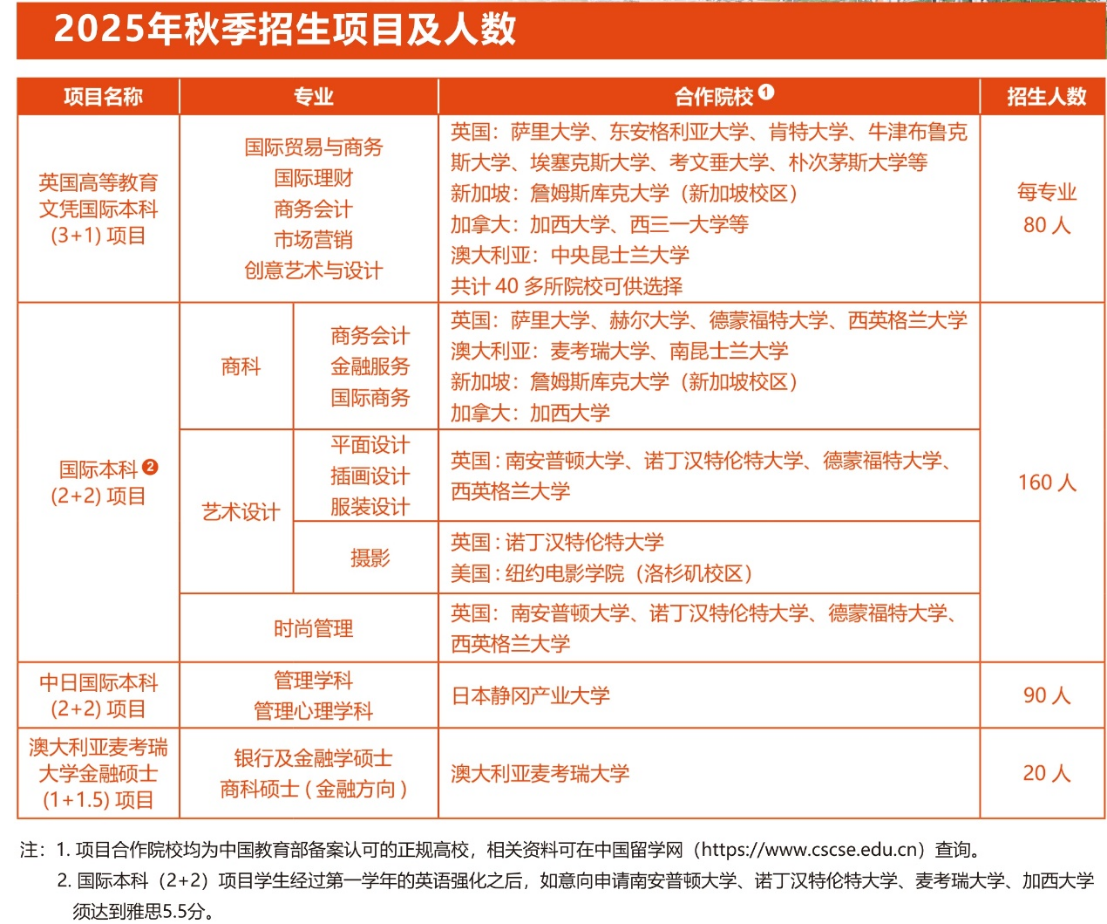 學院堅持“取中西之長,育國際英才”的辦學理念,充分利用廈門大學完善的教學設施和優勢學科資源,根據市場需求,開設國際貿易與商務、國際理財、商務會計、市場營銷、創意藝術與設計等專業,與英國、美國、澳大利亞、愛爾蘭、新加坡、日本等國家多所知名大學建立了長期、穩定的合作與交流關系,形成了獨具特色的“3+1”、“2+2”、“1+1.5”等國際本科/碩士教育品牌項目,致力于國內外優質教育的銜接,助力學生“安全留學、健康留學、文明留學、成功留學”,為推進中國與世界的交融發展培養具有全球視野與競爭力的人才。歷經20年的穩步發展,學院始終堅持規范獨立招生和校內辦學,辦學規模和學生培養質量均居于國內同類院校前列。